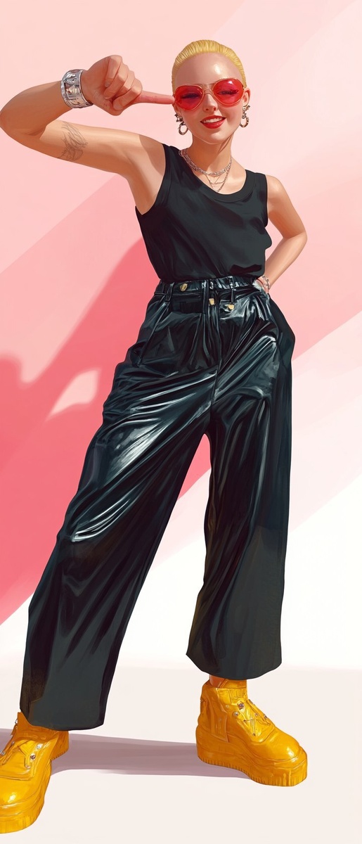 Создано на основе запроса: standing position, teenage, selfie, spaceships wig, egg sunglasses, cute, winking, V hand gesture, museum