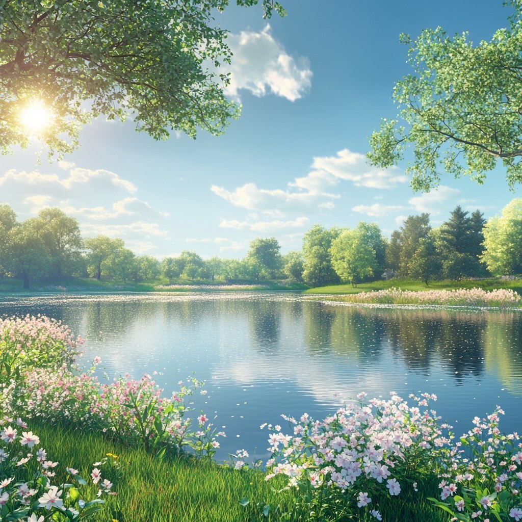 Автоперевод: Озеро весной в яркий солнечный день с цветущими цветами, высоким реализмом, высокой вибрацией, красивой, 8K AR 16: 9