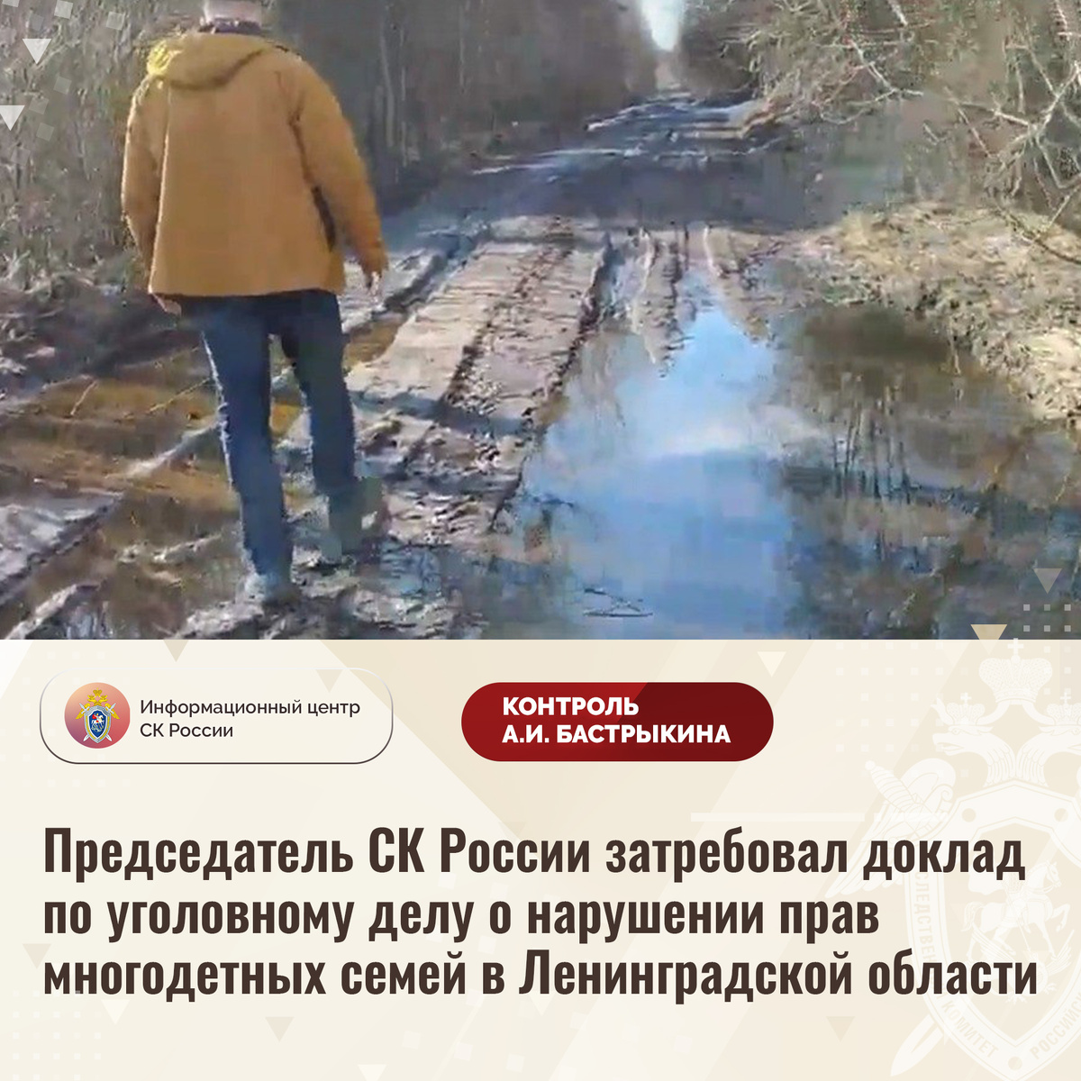 Председатель СК России затребовал доклад по уголовному делу о нарушении прав многодетных семей в Ленинградской области В СУ СК России по Ленинградской области возбуждено уголовное дело по факту нарушения жилищных прав многодетных семей в Ленинградской области. По данным следствия, в 2015 году гражданам выделены земельные участки в поселке вблизи города Шлиссельбурга, не оборудованные системами газо- и водоснабжения. Кроме того, подъездные дороги имеются только к землям, расположенным на первой линии. В результате на протяжении десяти лет семьи не могут начать возведение домовладений. Ситуация освещается в социальных сетях. Председатель Следственного комитета Российской Федерации Александр Иванович Бастрыкин затребовал у руководителя СУ СК России по Ленинградской области Сергея Тихоновича Сазина доклад о предварительных и окончательных результатах расследования уголовного дела. Исполнение поручения поставлено на контроль в центральном аппарате ведомства. #СледственныйКомитет #СКРоссии #