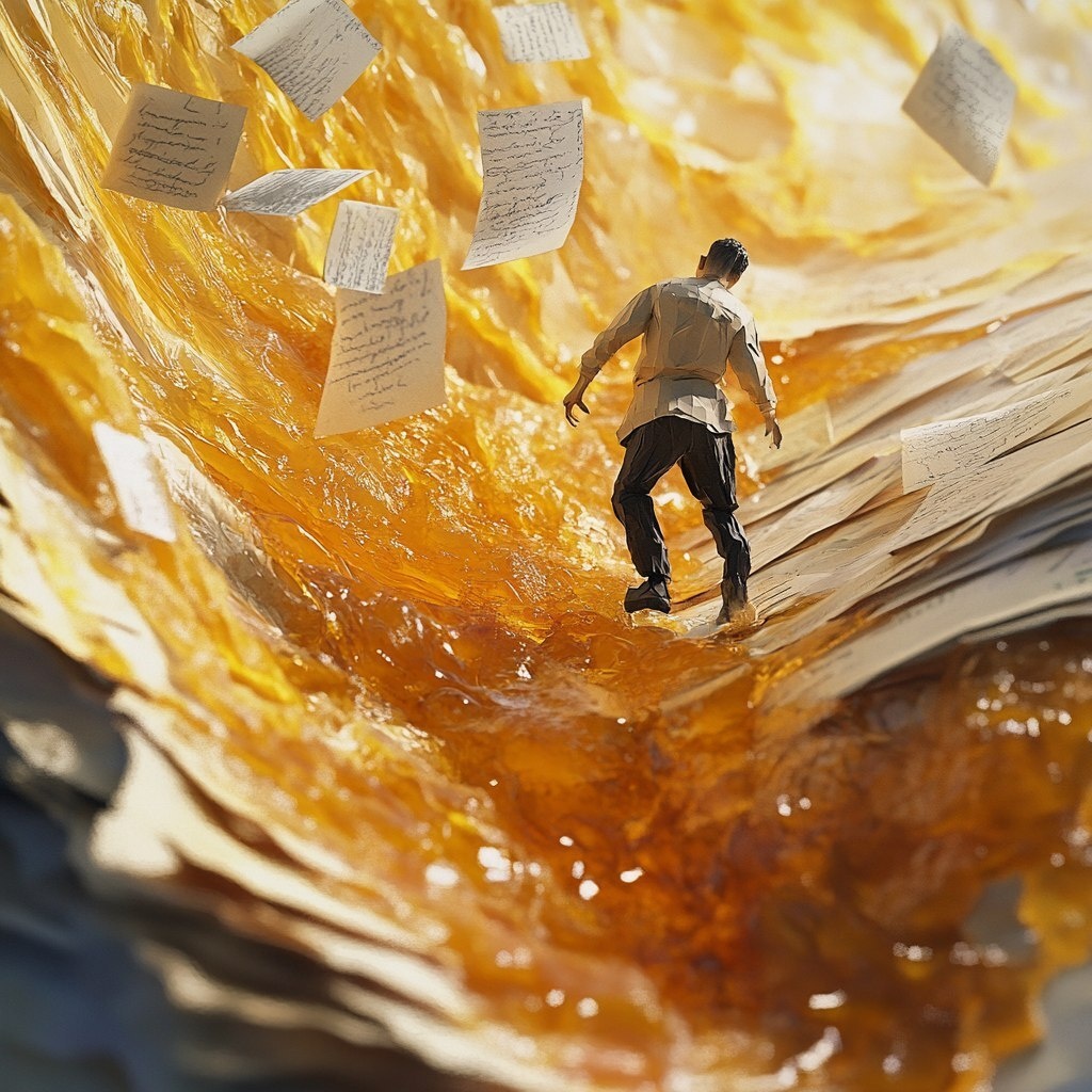 Создано на основе запроса: A paper figure trying to walk through thick honey, while ghostly memories fly around like torn letters 4D