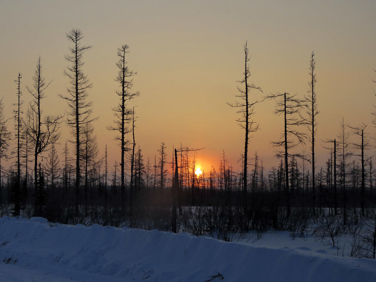 Морозным утром покинув Суринду, мы встречали таёжный рассвет: Заезд в Суринду отнимает около 50 километров: зимник мог бы проходить сквозь неё, да и проходит в 9 километрах по прямой от ближайшей околицы, однако дорога проложена так, чтобы от поворота до села было порядка 25 километров. Проложена вполне сознательно: три сотни жителей Суринды - почти исключительно эвенки, а про сложные отношения сибирских народов с алкоголем, думаю, слышали даже те, кто в Сибири никогда не бывал. Вот поселковые власти и объявили пьянству - бой, а для надёжности лишили подопечных возможности добывать "огненную воду" даже у дальнобойщиков. И на фоне всех не случившихся по пьяне драк, поножовщин, пожаров, обморожений лишние полтора часа пути - мелочь! Но покинув Суринду затемно, вновь поравнялись с ней, увидев зарастающую старую дорогу, мы уже под голубым небом. Ещё сколько-то часов пути - и местность начинается меняться: Над тайгой призрачно встают силуэты заснеженных плосковерхих гор, как миражи Путоран