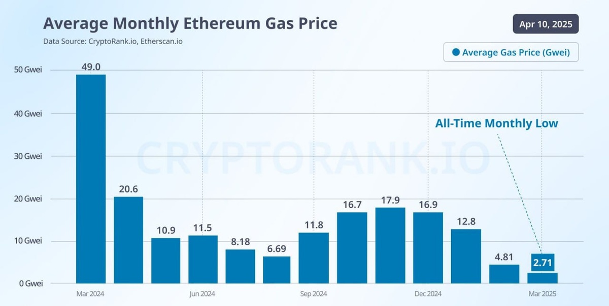 🔸В марте ежемесячная цена газа в сети Ethereum достигла в среднем 2,71 gwei, что примерно в шесть раз ниже, чем в конце 2024 года.