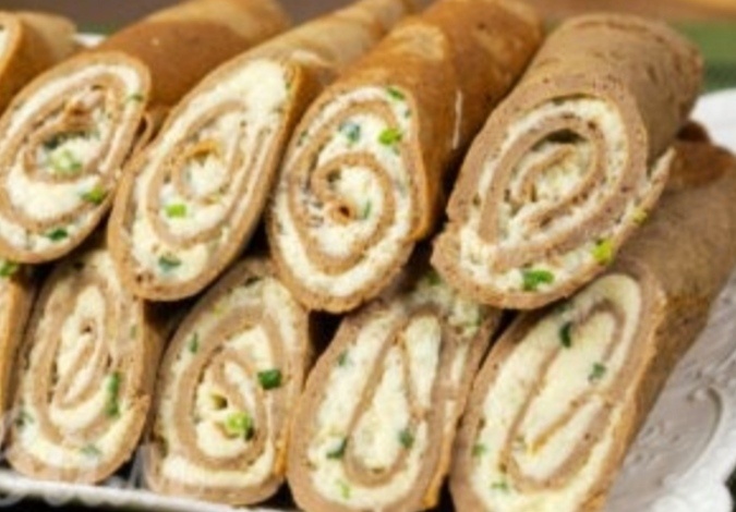 Печеночные блины: Начинка: Приготовим печёночные блины. С говяжьей печени снимаем плёнку и нарезаем на куски. Куски печени измельчаем до однородности в измельчителе или мясорубке. Сюда же разбиваем яйца и перемешиваем. Затем наливаем молоко, добавляем соль и перец по вкусу. Опять перемешиваем. Добавляем муку и перемешиваем. В самом конце в тесто наливаем 2-3 ст. л. растительного масла и окончательно перемешиваем. Жарим печёночные блины. Хорошо разогретую сковороду немного смазываем растительным маслом и наливаем на неё тесто, распределяя его по сковороде. Жарим блины с двух сторон до золотистой корочки. Из этого количества ингредиентов у меня получилось 19 блинов. Приготовим нежную яичную начинку для печёночных блинов. Варёные яйца трём на крупной тëрке. Добавляем к яйцам пучок мелко нарезанного укропа и мягкий плавленый сыр. Все немного солим и перчим, выдавливаем зубчик чеснока через пресс. Всё хорошо перемешиваем. Начинка готова. Начиняем блины. Печёночный блин смазываем по