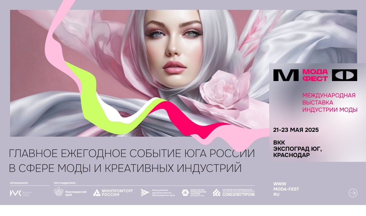 С 21 по 23 мая 2025 г. в г. Краснодаре состоится Международная выставка индустрии моды «МодаФест» – площадка для производителей одежды, обуви, аксессуаров, изделий из меха и кожи, бижутерии и ювелирных изделий, тканей и фурнитуры, оборудования и комплектующих, текстиля, а также потребителей (байеров), представителей контрактного производства и швейного аутсорсинга.