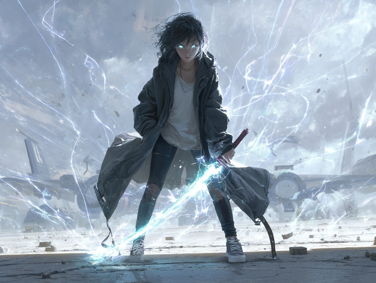 Создано на основе запроса: full-body shot of a mysterious anime-style young woman with messy black hair and glowing eyes, wearing a black long coat over a casual t-shirt and pants, standing on cracked concrete ground in front of spaceships, gripping a large glowing energy sword embedded in the ground, electric sparks and energy arcs swirling around the sword, magical aura effects, intense lighting, cinematic anime style, ultra-detailed, dynamic pose, dramatic composition, 4K, digital art --- Автоперевод: Снимк загадочной молодой женщины в стиле аниме с грязными черными волосами и светящимися глазами, одетая в черное длинное пальто над повседневной футболкой и брюками, стоящим на потрескавшейся бетонной земле перед космическими кораблями, схватывая большой сияющий энергия, встроенный в землю, электрические искры и энергетические дуги, крутящие поэшео Как тебе этот вариант? 🤔 https://dzen.ru/id/65c0c65c86e4f837c27b24d7 #ИИ #AI #нейросеть #midjourney #art