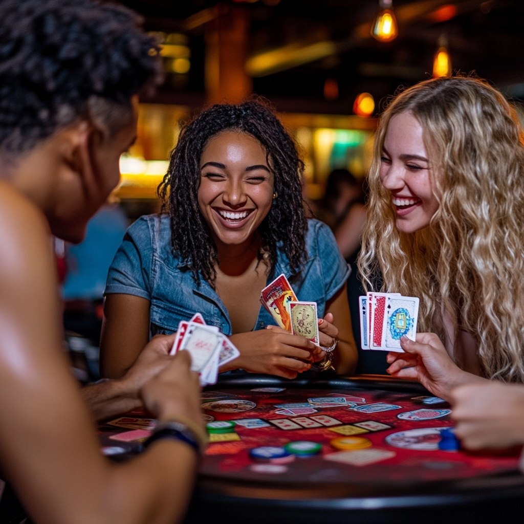 Создано на основе запроса: A vibrant UNO card game tournament at a stylish bar event space, photorealistic party scene a diverse group of young adults Black, Latino laughing, dancing, and playing UNO at a table colorful UNO cards in action, casual fun atmosphere, energetic weekend night vibe, people in trendy outfits, warm indoor lighting, candid smiles, festive decorations, music and good vibes, highly detailed, realistic photo style ar 16:9 v 6 style photographic --- Автоперевод: Живой турнир Uno Card Game в стильном пространстве для мероприятий в баре, фотореалистической партийной сцене. Разнообразная группа молодых людей чернокожих, латиноамериканских смеха, танцев и играющих на столе с красочными картами Uno в действии, повседневной веселой атмосфере, энергичной ночной атмосферу выходного дня, «Люди в модных нарядах», «Теплое освещение», «Стопковые светильники», «Фестивальные декорации» и «Хорошие вибрации». Отлично выглядит? 🤔 https://dzen.ru/id/65c0c65c86e4f837c27b24d7 #ИИ #