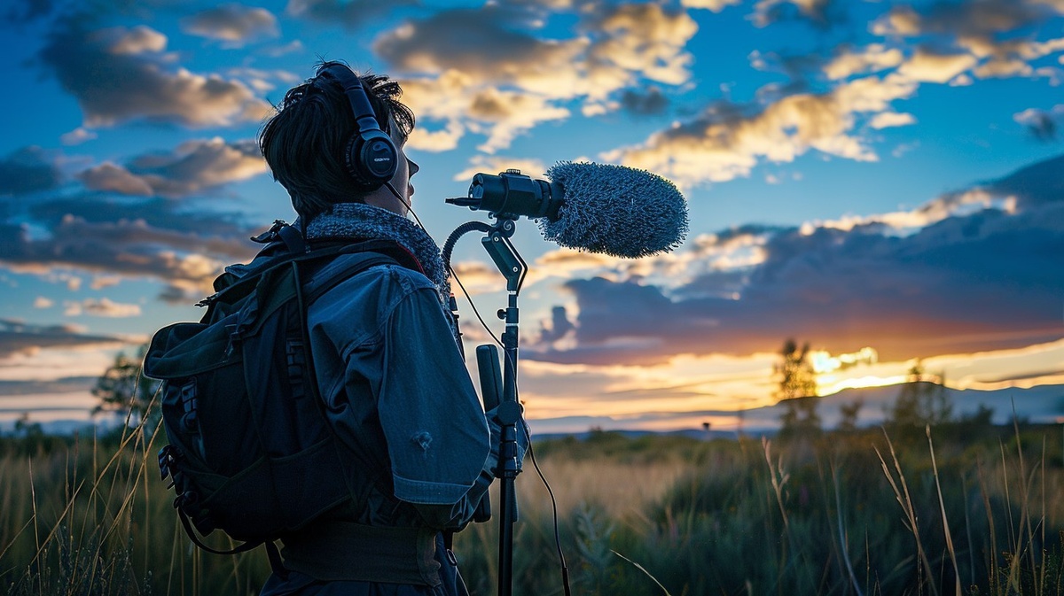 Создано на основе запроса: hyper-realistic photo of a location sound recordist holding a large boom mic