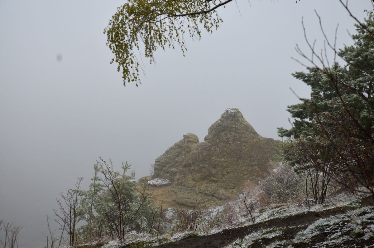 Чтобы забраться на самый-пресамый верх, можно подняться ножками по терренкуру 3, или на подъемнике, или как мы. Подъёмник не работает,по терренкуру идти весь маршрут не осилили б, плюс погода была прям ох. Поэтому поехали наверх на машине, вот📍 сюда . Там стоянка, бросаешь машину и пошёл до смотровой вдоль забора спортивной базы. Кстати, Яндекскарты пишут, что ой, идите осторожно, обрыв. Ну там до обрыва, как до той женской бани из анекдота. Так что идите, не боясь. Потрясающие виды по дороге. Вот ради них туда точно надо добраться. А многие ведь приезжают на верхнюю станцию, сфоткали и вниз. Все скалы на что-то да похожи)) Почему им никто не придумал название и не нанёс на карту? Займусь на досуге и создам новые точки на карте. Потом поворачиваем направо: кафе, станция подъёмника, беседка Семь ветров, и пошел вниз терренкур 3. Много красивых мест по дороге, мы нашли где срезать и вываляться в грязи. У памятника Лермонтову начался град. Мелкий, но противный. Мне градинка в глаз у