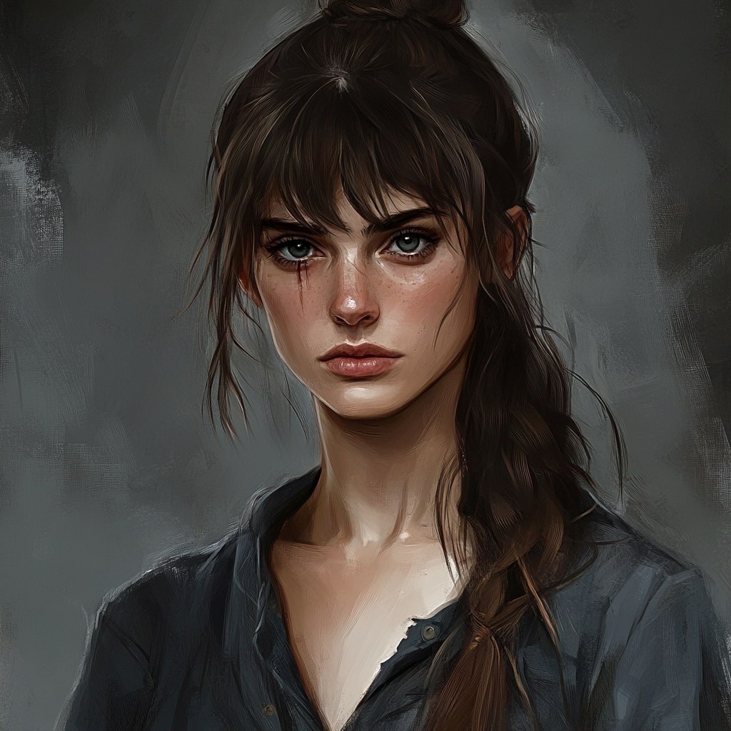 Создано на основе запроса: 20 years old woman, apprentice blacksmith, long brown hair, bangs, bun, a scar over her left eye, innocent, serious, hardened, disco elysium style art