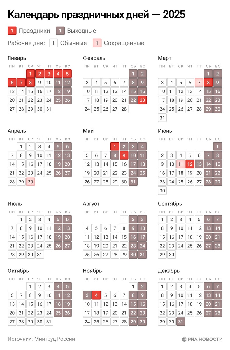 Россиян ждет 8-дневный отдых на майские праздники В 2025 году майские каникулы продлятся восемь дней: с 1 по 4 мая и с 8 по 11 мая. Об этом напомнила Юлия Санина, эксперт сервиса "Работа.ру". 1 мая (День труда) и 9 мая (День Победы) — официальные праздничные выходные. Дополнительные дни отдыха 2 и 8 мая образовались за счет переноса выходных с 4 января и 23 февраля соответственно. Таким образом, россияне смогут отдохнуть сразу две четырехдневные "мини-недели" с одним рабочим днем между ними (7 мая, среда).