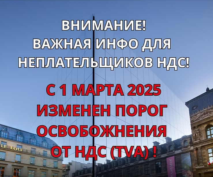 ВНИМАНИЮ ПРЕДПРИЯТИЙ-НЕПЛАТЕЛЬЩИКОВ НДС ВО ФРАНЦИИ! ИЗМЕНЕН ПОРОГ ОСВОБОЖДЕНИЯ ОТ НДС (TVA) ! Принятая в понедельник, 3 февраля был окончательно принят законопроекта о финансах 2025 года. Помимо прочего им предусмотрены изменения в освобождении уплаты НДС. Теперь создан единый порог освобождения от НДС в размере 25 000 евро для всех видов деятельности! Увеличенный порог будет переоценен до 27 500 евро. Конкретно для предпринимателей это означает, что: - если их оборот за предыдущий календарный год ниже 25 000 евро (порог освобождения от налога), основное освобождение продолжает применяться; - если оборот компании превышает порог освобождения от уплаты налога в размере 25 000 евро, но не повышенный порог в размере 27 500 евро, компания облагается НДС с 1 января следующего года (1 января 2026 года); - если их оборот в 2025 году (текущий календарный год) превышает пороговое значение в 27 500 евро , то компания облагается НДС со дня превышения; Этот порог будет применяться только с 1 март