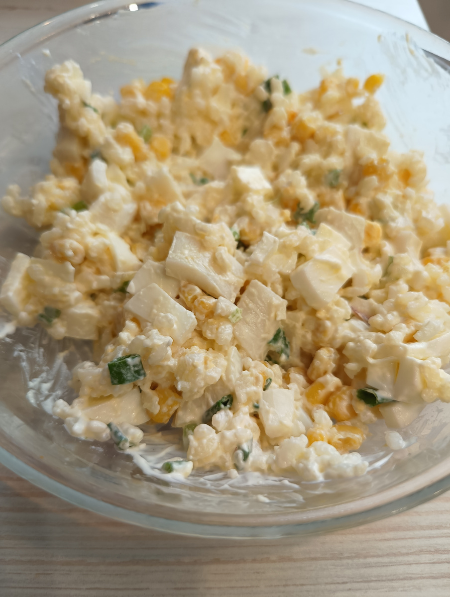 Здравствуйте, уважаемые читатели моего канала. Недавно судьба занесла меня в подмосковный дом отдыха для педагогов. Хотя моя поездка была деловой, нам предложили трёхдневную программу с питанием. Еда там оказалась на высоте, и особенно мне запомнился один салат — настолько вкусный, что я сразу решила повторить его дома. К счастью, распознать ингредиенты не составило труда, и теперь этот салат стал нашим семейным фаворитом среди салатов. Просто пальчики оближешь! Я обязательно приготовлю его на Пасху! Ингредиенты: - Рис — 150 г в сухом виде (предварительно отварить) - Консервированная кукуруза — 1 банка - Кальмары — 400 г (отварить) - Куриные яйца — 4 шт. (сварить вкрутую) - Зелёный лук — 60 г - Майонез, соль — по вкусу Приготовление: Отвариваем рис до готовности, пока он не станет мягким, но сохраняет форму. Кальмаров варим пару минут после закипания воды — важно не передержать, чтобы мясо осталось нежным. Яйца очищаем от скорлупы и нарезаем кубиками. Лук мелко рубим ножом. Смеши