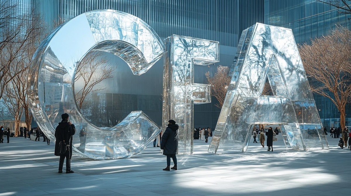 Создано на основе запроса: an image set in the plaza of the WTC in New York, featuring three, transparent clear glass letters, the three letters: C,F and A, made from glass, 10ft tall, totally transparent, photographic capture,