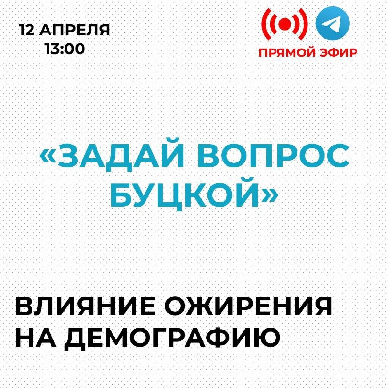 ⚡️АНОНС: «Задай вопрос Буцкой» Друзья, продолжаем общаться в рамках прямых эфиров. В этот раз обсудим вопрос здоровья, а именно — проблему ожирения в стране. По оценкам Минздрава, это порядка 40 млн человек, или 27% населения. Это может показаться неочевидным, но ожирение у женщин репродуктивного возраста сказывается на шансах забеременеть. Кроме того, ожирение влияет и на течение беременности. Один из примеров — количество выкидышей превышает 25%. Также обсудим вопрос влияния этого недуга на демографию и важности обучения детей правильному питанию с самого детства. 🕥 Эфир состоится в субботу, 12 апреля, в 13:00. 👉 Как всегда, направляйте свои вопросы моему помощнику, в ходе эфира я постараюсь на все ответить! Контакт: @dv_stp (Дмитрий).