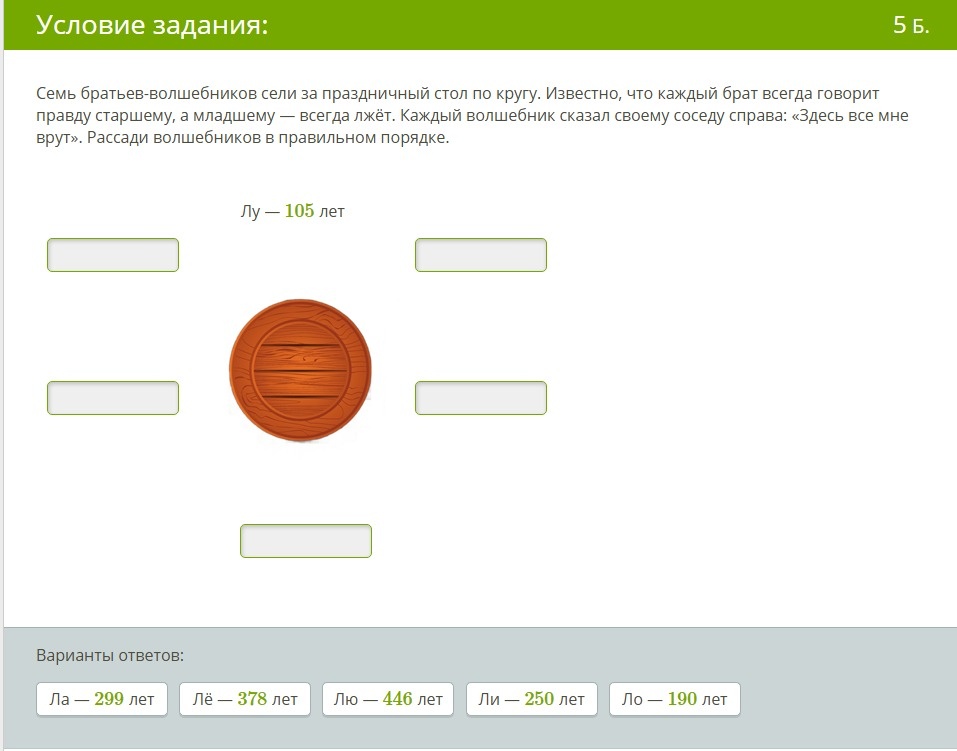 Семь братьев-волшебников сели за праздничный стол по кругу. Известно, что каждый брат всегда говорит правду старшему, а младшему - всегда лжёт. Каждый волшебник сказал своему соседу справа: «Здесь все мне врут». Рассади волшебников в правильном порядке.