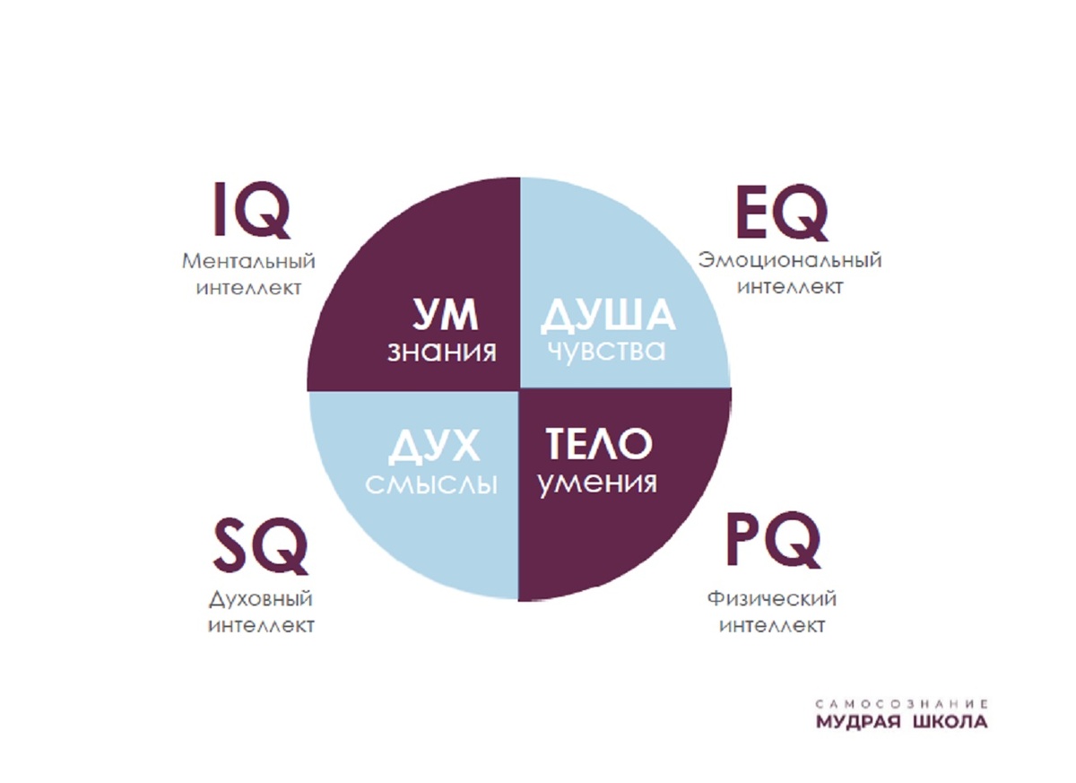 Целостность личности — ключ к гармоничному развитию, раскрытию потенциала, уверенности, счастью и полноценной жизни. Она включает в себя баланс между четырьмя сферами личности - телом, умом, душой и духом, которые требуют равного внимания. Сбалансированное развитие всех сфер делает человека успешным и самореализованным в личной и профессиональной сферах. Целостный человек пребывает в гармонии с собой, людьми и миром, потому что ни одна его сфера не находится в конфликте с другой. Гармоничные отношения с миром начинаются с мира внутри себя. Четыре составляющие личности становятся ее силами, ее центрами управления, если она умеет ими осознанно пользоваться. Постоянно прокачивая каждую сферу, человек обретает новые способности, делает их разновидностями своего интеллекта и становится целостным. Эти четыре составляющие можно назвать четырьмя основными интеллектами человека. Каждой сфере соответствует свой вид интеллекта: физический, ментальный, эмоциональный, духовный. Источник энергии и х
