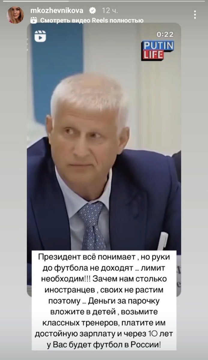 Актриса, экс-депутат Госдумы РФ и дочь двукратного олимпийского чемпиона по хоккею Александра Кожевникова опубликовала в сторис инстаграма разговор на заседании Совета по физической культуре и спорту президента России Путина и президента «Зенита» Сергея Фурсенко в 2017 году. Фурсенко заявил: «Футбол станет истинно русской игрой». Путин отреагировал: «Вот молодец, Сергей! Истинно русская игра – футбол. 8 иностранцев бегают на поле за «Зенит» в Лиге Европы. Во молодец! Интересно вы нам все рассказали». «Президент все понимает, но руки до футбола не доходят… Лимит необходим!!! Зачем нам столько иностранцев, своих не растим поэтому… Деньги за парочку вложите в детей, возьмите классных тренеров, платите им достойную зарплату, и через 10 лет у вас будет футбол в России!» – написала Кожевникова, комментируя видео. Изображение: instagram.com/mkozhevnikova/