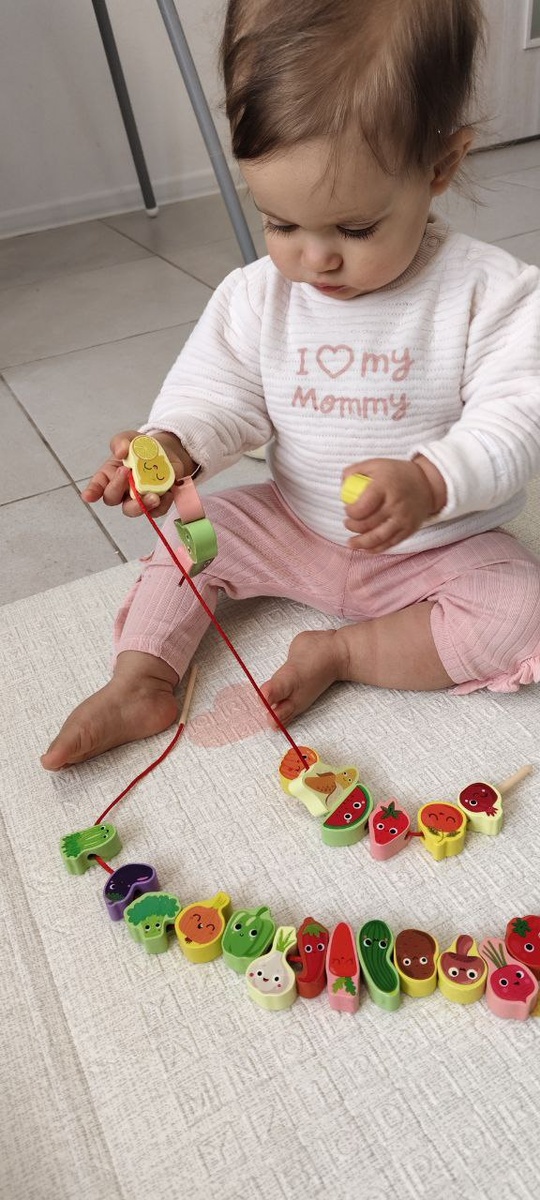 Как нанизывать овощи и фрукты Арианна пока не поняла, зато ей очень нравится их разбрасывать везде и (что немаловажно) складывать обратно в коробочку.