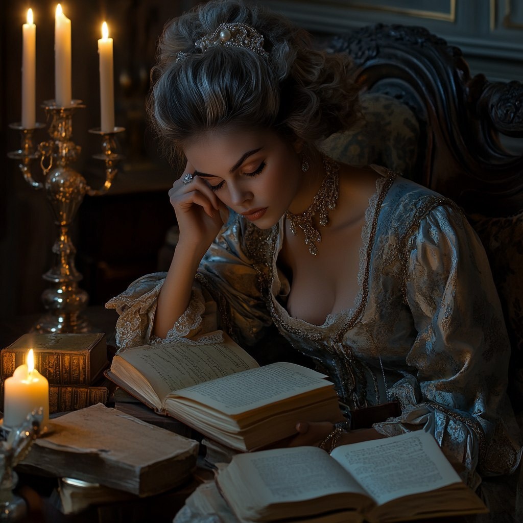 Создано на основе запроса: 18th century empress reading books and writing letters, surrounded by candlelight and antique books, elegant