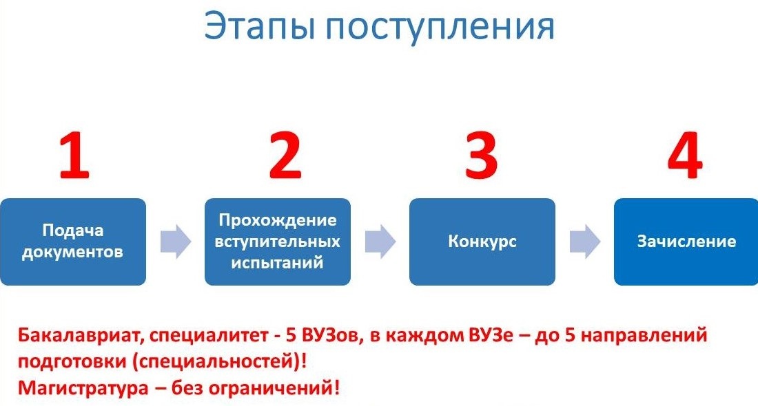 Уважаемые гости и подписчики канала! С сегодняшней публикации мы начнем более подробно освящать отдельные аспекты Приемной кампании. Сегодня более подробно расскажем как осуществляется алгоритм поступления на программы высшего образования. Согласно действующего законодательства процедура поступления на программы высшего образования осуществляется на конкурсной основе и включает в себя ряд этапов: 1) подача документов на поступление; 2) прохождение вступительных испытаний; 3) конкурсные процедуры; 4) зачисление. Подача документов на поступление. Подать документы на поступление можно одним из способов: 1) лично, обратившись в пункты приема документов; 2) через операторов почтовой связи; 3) через портал Госуслуг (наиболее простой вариант). Перечень принимаемых документов включает в себя: 1) паспорт; 2) документ об образовании; 3) СНИЛС; 4) иные документы (подтверждающие индивидуальные достижения, льготы и прочее, при необходимости). Если используете для подачи портал Госуслуг, ничего, кро