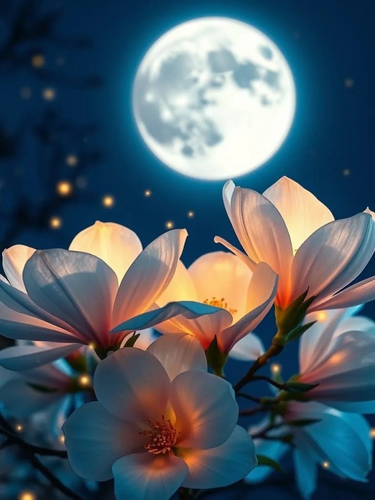 group of glowing flowers with full moon in the background, fireflies floating around, digital art, hyper-realistic beautiful photo], fireflies, stunning beauty, sergei krasovsky, 50, magnolias, blue moon, beautiful details, stunning backdrop, clear moon, amazing beauty, professional photography. UHD, 8K. #neuroart #нейроарт #ai #ии #нейросеть #картинки #искусственныйинтеллект #цифровоеискусство #digitalart #арт #art #prompt #промпт #подсказка