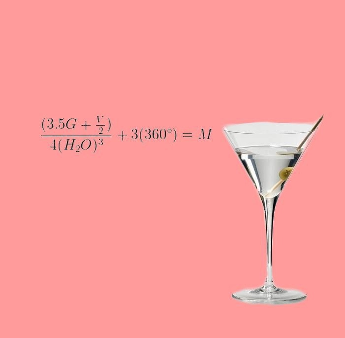 Ну что, друзья, готовимся к пятнице? Тогда берём ручку Паркер (да, да, именно Паркер) и записываем эту формулу. Ничего не поняли? Вот и физики, химики и математики 70-х годов прошлого века, когда компания Parker опубликовала рекламу своих ручек с этой записью, не поняли ничего. Формула привлекла к себе внимание, и учёные не успокоились, пока не написали производителю шариковых ручек мешок писем с вопросами о смысле загадочного математического выражения. Все были поражены, когда узнали, что именно так математически записывается рецепт мартини: 3,5 части джина и половина части вермута с четырьмя кубиками льда (вода — H2O возведённая в куб равно лёд), взболтанные 3 движениями (3х360⁰).😉