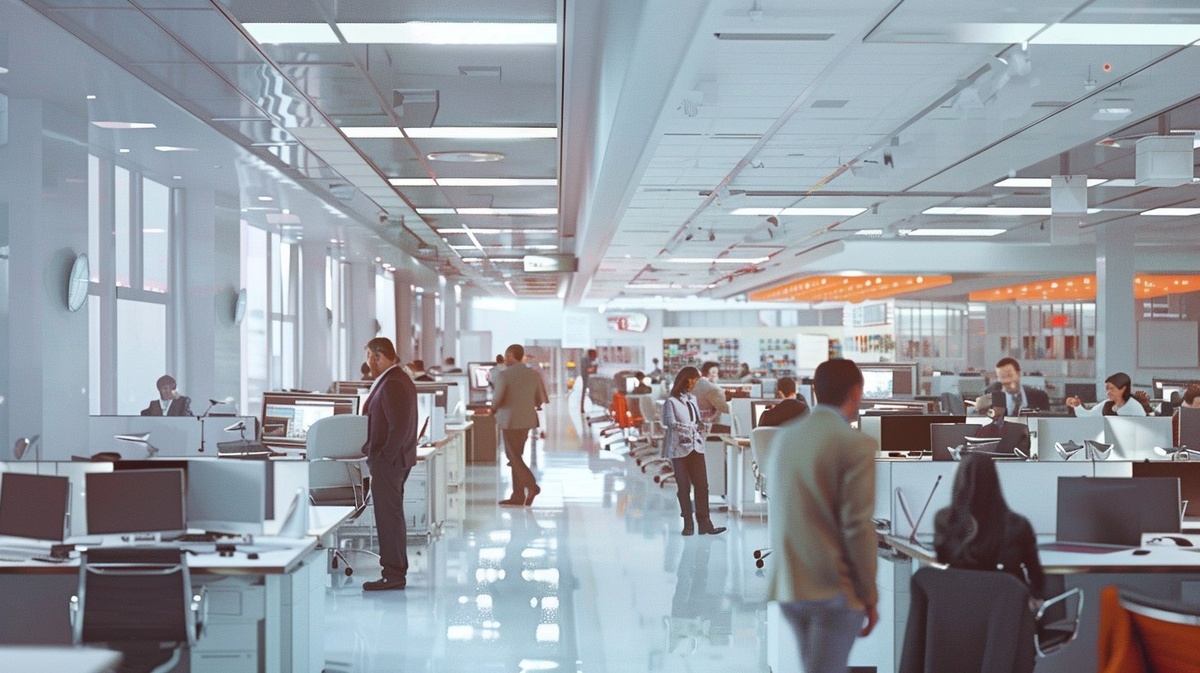 Создано на основе запроса: hyper-realistic photo of a bright modern very busy newsroom with journalists in the foreground chatting