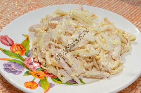 Салат с курицей и яичными блинчиками От автора: Салат с курицей и яичными блинчиками на удивление вкусный, нежный и легкий салатик. Не смотря на то, что готовится из минимального количества ингредиентов. Будет прекрасной закуской на любом празднике. Ингредиенты: Куриная грудка - 400 гр. Лук репчатый - 1 шт. Яйцо - 8 шт. Майонез - 80 гр. Для маринада: Сахар - 5 гр. (0,5 ч.л.) Соль - 3 гр. (щепотка) Уксус столовый 9 процентный - 10 мл. (2 ч.л.) Вода - 100 мл. Источник: https://rusdinner.ru/page/salat-s-kuricej-i-jaichnymi-blinchikami