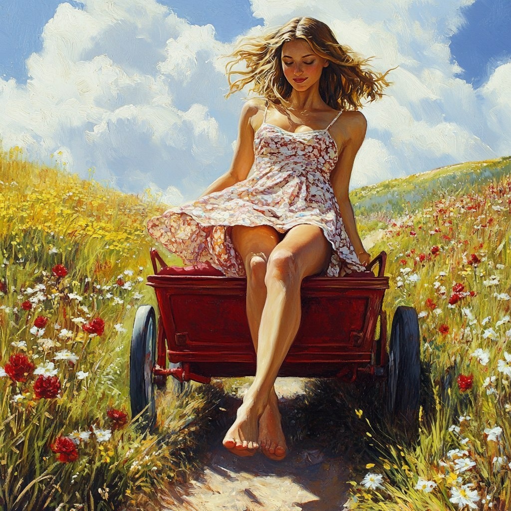 Создано на основе запроса: a barefoot, attractive, healthy attractive healthy female in a sundress careening downhill in a red wagon