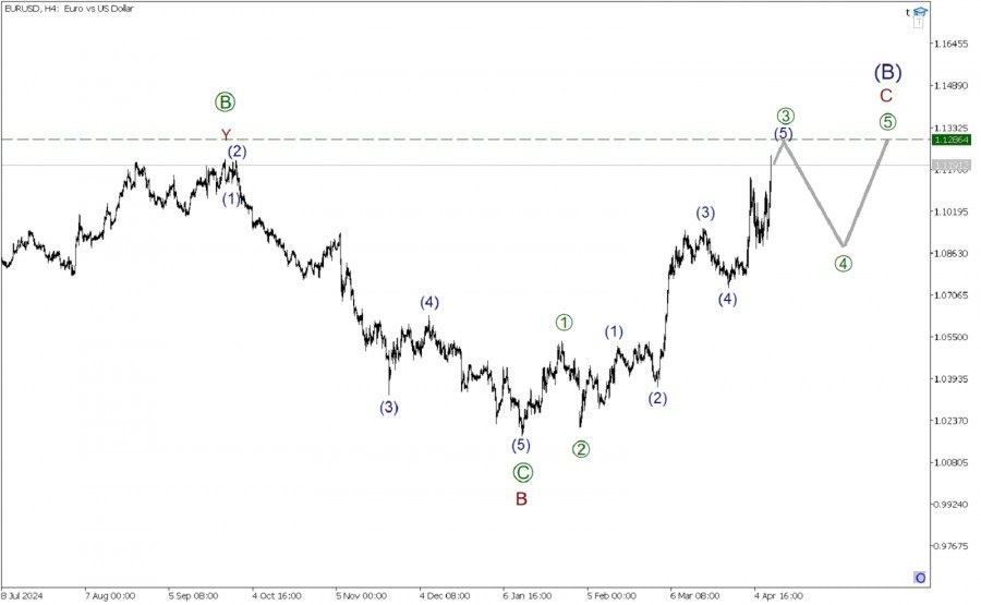 Предполагается, что в долгосрочной перспективе по криптовалютной паре EUR/USD формируется крупный зигзаг (A)-(B)-(C). Сейчас формируется крупная коррекционная волна (B), которая принимает форму восходящего зигзага A-B-C. На четырехчасовом таймфрейме представлена разметка конечной части коррекции B, после которой цена пошла вверх в импульсе C.