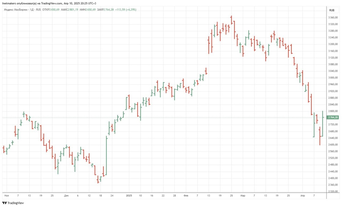❗️10 апреля российский фондовый рынок ушел вверх, индекс МосБиржи вырос на 4,29% до уровня 2764,28