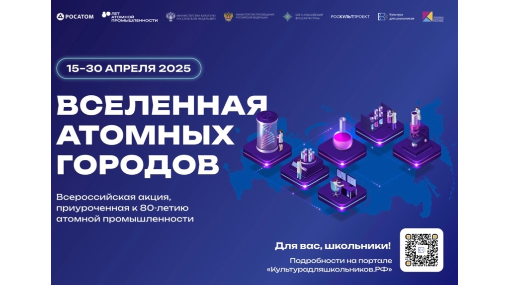 С 15 по 30 апреля в рамках межведомственного культурно-образовательного проекта «Культура для школьников» при содействии программы «Территория культуры Росатома» пройдёт Всероссийская акция «Вселенная атомных городов», посвящённая 80-летию атомной промышленности в России.