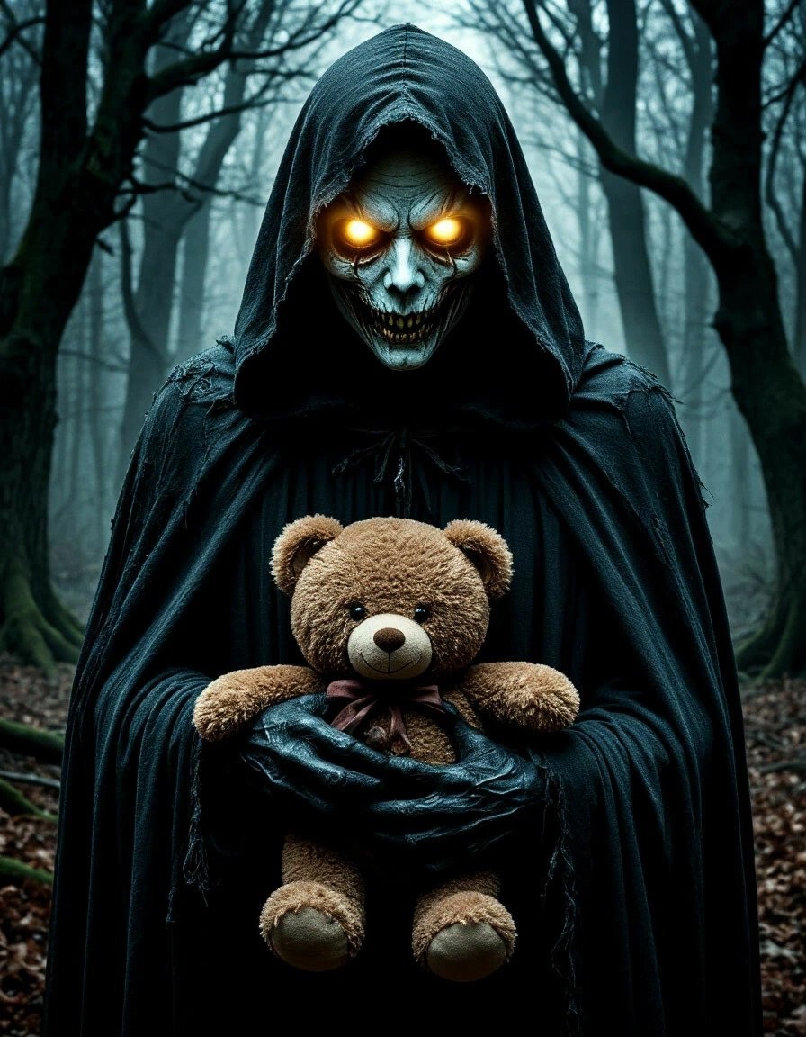 Creepy horror character with glowing eyes, dressed in a dark cloak and holding a teddy bear, on the background of a creepy forest, in the
