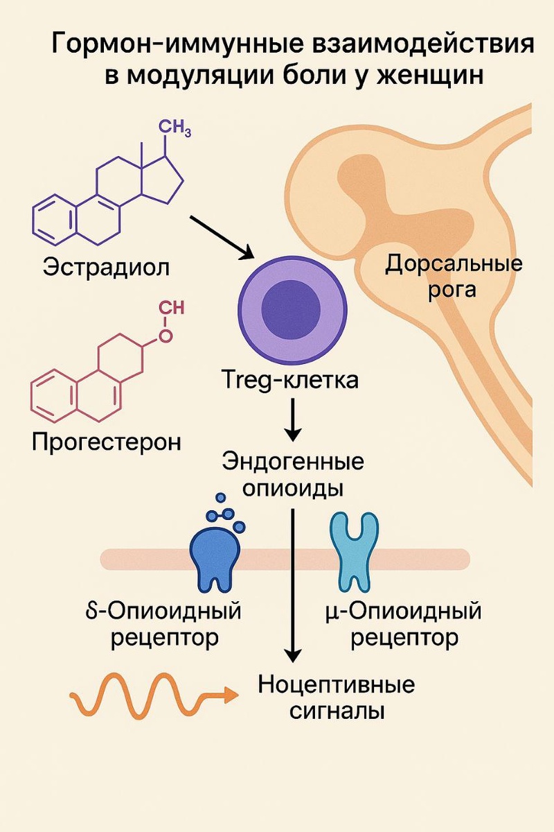 Боль под контролем: как женские гормоны формируют естественное обезболивание Современные исследования подтверждают, что женские половые гормоны — эстроген и прогестерон — играют ключевую роль в модуляции болевой чувствительности. Под их влиянием Т-регуляторные клетки спинного мозга синтезируют эндогенные опиоиды, такие как энкефалины и β-эндорфины, которые подавляют передачу болевых сигналов на уровне дорсальных рогов. Этот механизм демонстрирует выраженный половой диморфизм и объясняет, почему женщины в репродуктивном возрасте имеют более эффективную систему эндогенной анальгезии, чем мужчины. Эстрадиол, проникая через гематоэнцефалический барьер, связывается с ядерными рецепторами в Т-регуляторных клетках, стимулируя выработку энкефалинов. Молекулярные исследования показали, что эстроген усиливает экспрессию гена проэнкефалина, увеличивая уровень этих опиоидов. Прогестерон дополняет действие эстрогена, стабилизируя рецепторы и усиливая их активность. Максимальные уровни эндогенных