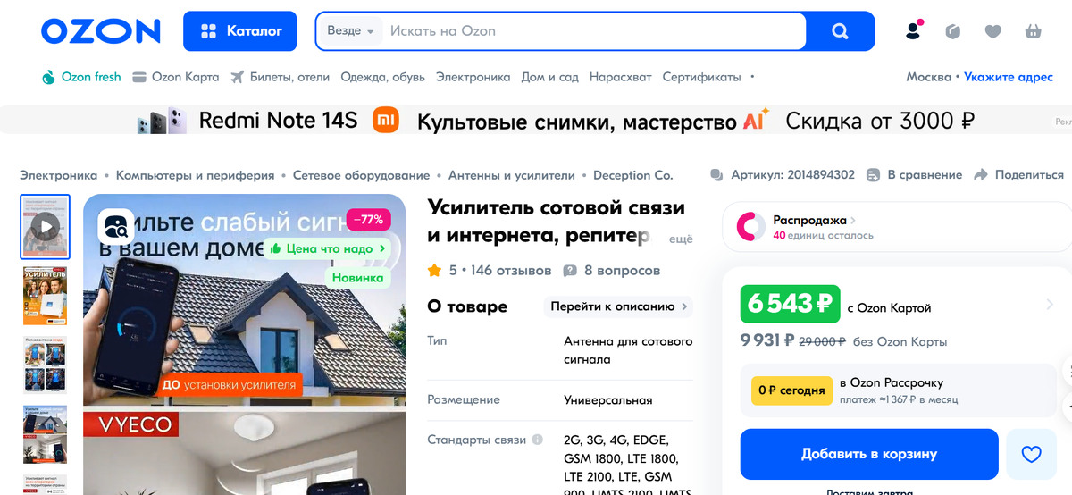 Живя в городе, мы привыкли к стабильному интернету и хорошей связи, но в деревне у моих родителей (Саратовская область) ситуация была печальной: телефон ловил одну-две палки, а про быстрый интернет можно было только мечтать. Видеозвонки постоянно прерывались, а загрузка страниц превращалась в испытание. После очередного визита я решил исправить ситуацию и купить усилитель сигнала сотовой связи. Почему именно этот комплект? Я долго изучал отзывы и консультировался со знакомыми, чтобы выбрать оптимальное решение. В итоге остановился на готовом наборе, с Ozon артикул 2014894302 который включал: · Усилитель сотовой связи и интернета (репитер) – ловит слабый сигнал с вышки и усиливает его в доме. · Внешняя антенна – устанавливается на крыше или столбе, чтобы уловить максимально возможный сигнал. · Внутренняя антенна – распределяет усиленный сигнал внутри дома. · Коаксиальный кабель 15 метров – соединяет внешнюю антенну с репитером. · Блок питания – для работы усилителя. · Монтажный комп