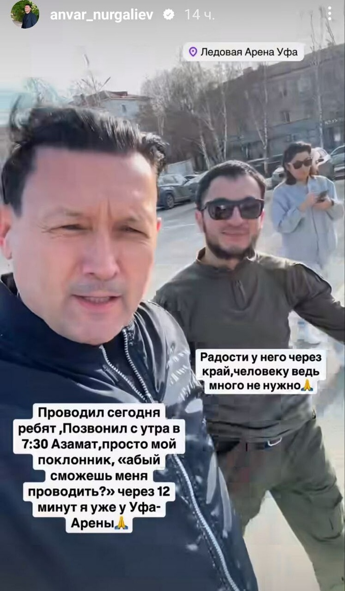 Народный артист Башкортостана и заслуженный артист Татарстана Анвар Нургалиев проводил своего фаната на специальную военную операцию. На видео видно, как военный, переполненный эмоциями, общается с певцом, шагая рядом с ним. «Сегодня провожал ребят на спецоперацию. В 7:30 мне позвонил мой поклонник Азамат: «Братан, можешь проводить меня? Через 12 минут буду возле «Уфа-Арены». Человеку ведь много не нужно. Когда я приехал, его радости не было предела. Парни, возвращайтесь живыми и с победой! Эмоции зашкаливают. Это очень тяжело. Вы — настоящие герои!» — написал певец на своей странице в соцсетях.
