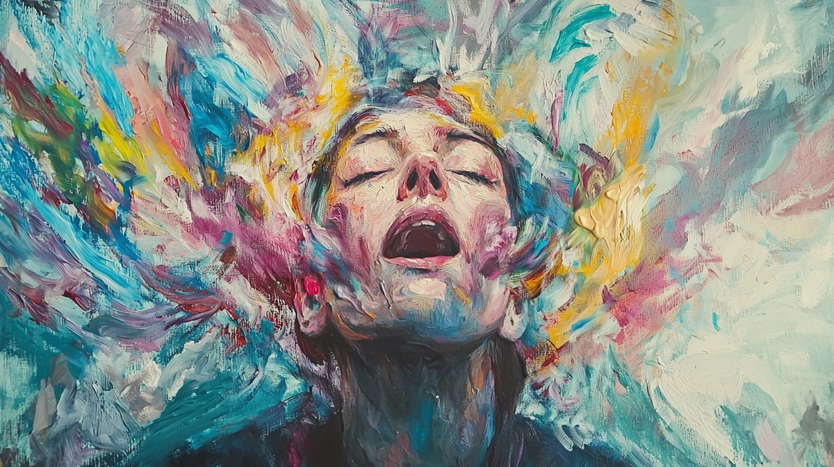 Создано на основе запроса: A hyper-realistic portrait fading into a cloud of colorful emotion-based energy waves and paint strokes, every