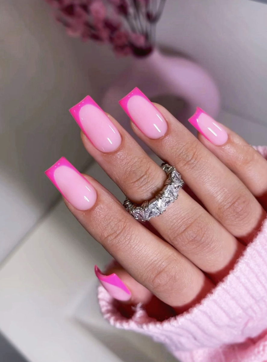 Вот честно: если классический френч вам кажется слегка скучноватым, этот вариант может стать глотком свежего воздуха. База — спокойный розовый нюд, а вот по краю и у самой кутикулы — яркая неоновая обводка. Визуально — ухоженно и аккуратно, но с характером. Такой маникюр словно шепчет: «Да, мне не 20, но я ещё фору дам!»