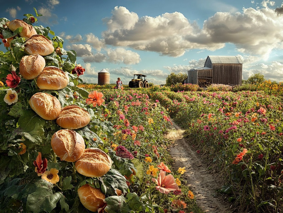 Создано на основе запроса: a photograph of plants that have loaves of bread growing on them. The bread grows out of flowers on the vine. A farmer and his wife are harvesting the loaves of bread. There is a barn with a silo and a tractor in the distance. Sunny sky with a few clouds. Sony A65 camera. --- Автоперевод: Фотография растений, у которых на них растут хлеб. Хорошо вышло? 🤔 https://dzen.ru/id/65c0c65c86e4f837c27b24d7 #ИИ #AI #нейросеть #midjourney #art
