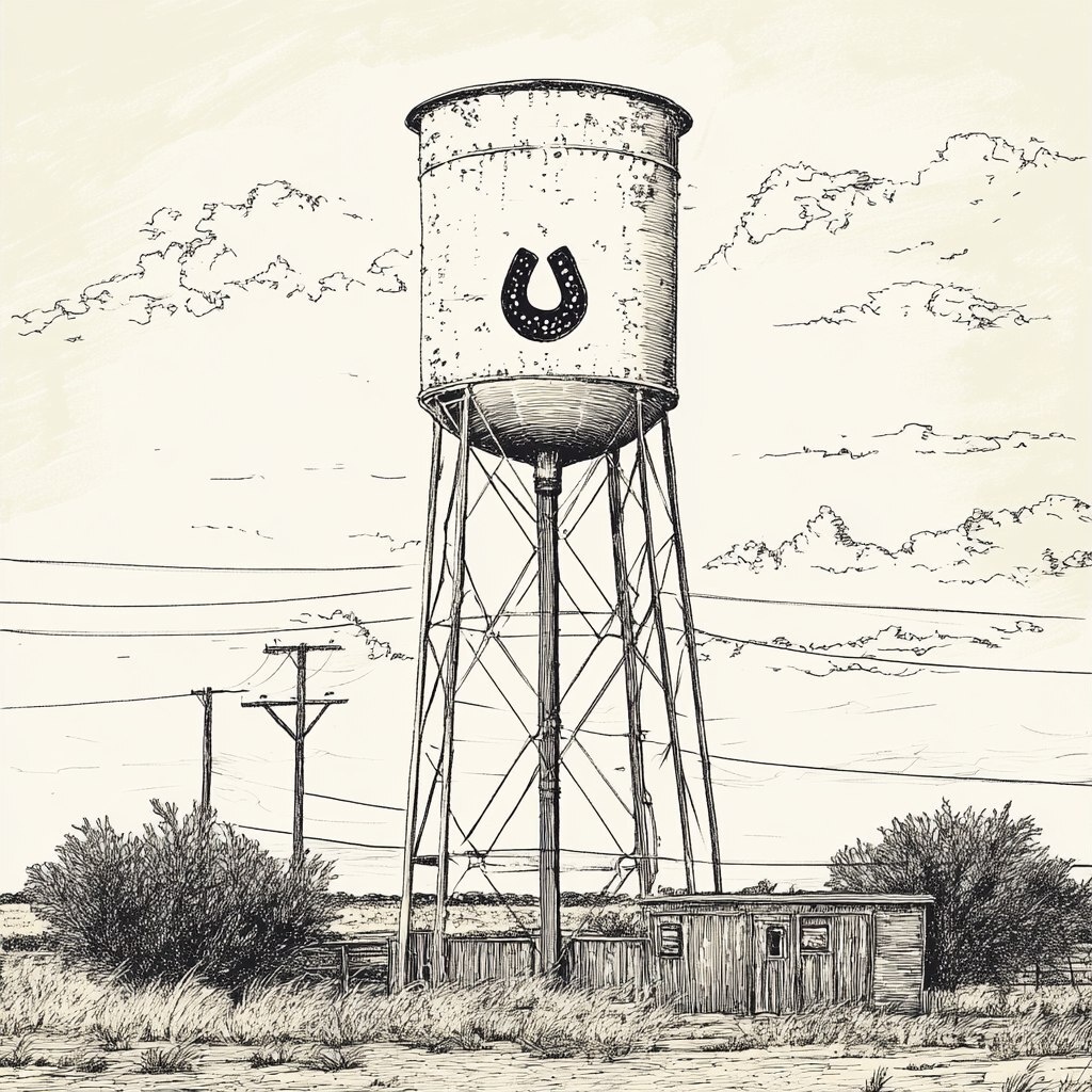 Создано на основе запроса: a white water tower in west texas with a black horseshoe logo, hand drawn art