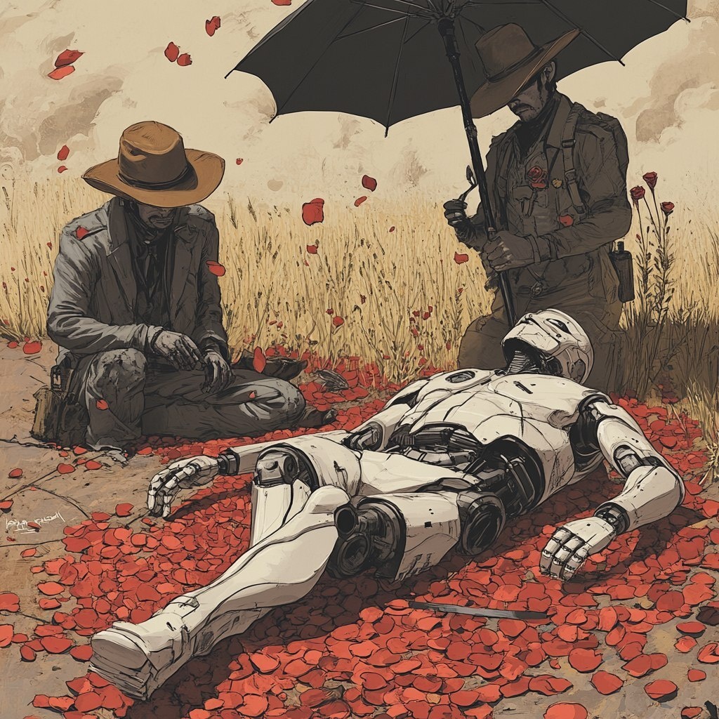 Создано на основе запроса: A robot lying on the ground, covered in rose petals, being examined by two men wearing cowboy hats and holding