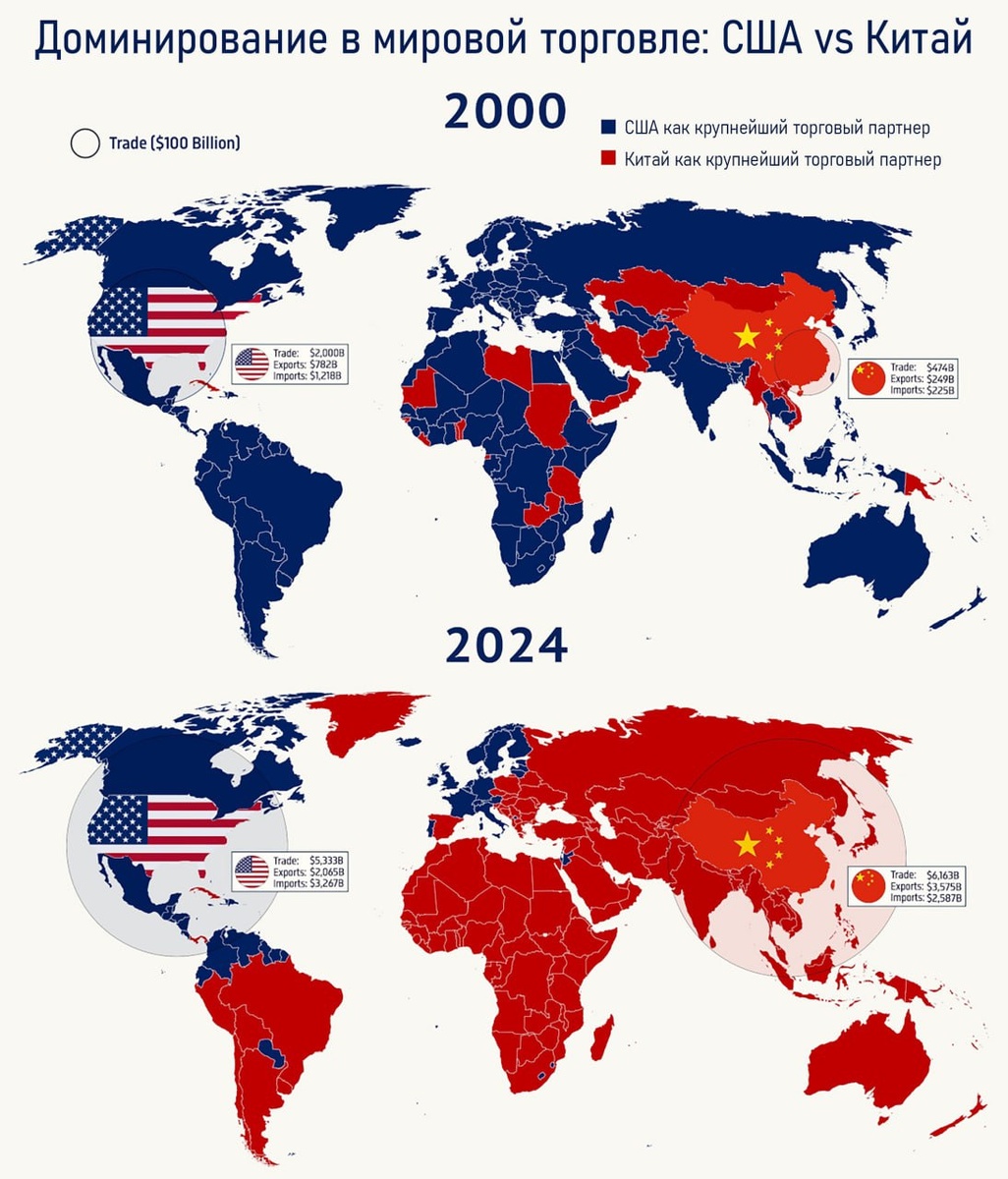 Почему США начали торговую войну, прежде всего с Китаем? Перед постом нашего мнения о пошлинах немного дадим вводных данных. Как к этому вообще пришло. На картинке сверху видна главная причина: Китай стремительно увеличивал свою долю в мировой торговле, а США теряли позиции. Торговая война — это попытка США переломить эту тенденцию и хотя бы частично восстановить своё влияние. Ключевой тренд: Китай доминирует, США отступают За последние 25 лет Китай превратился из второстепенного игрока в крупнейшую торговую державу мира. Если бы этот тренд лениво продолжился, экономическое влияние США продолжало бы сокращаться, а КНР — укрепляться. Цифры торгового экспорта говорят сами за себя : за 2000 год: • Китай — 3,9% ($253 млрд) • США — 12,1% ($786 млрд) за 2023 год: • Китай — 14,0% ($3,5 трлн) • США — 7,5% ($1,87 трлн) С 2000 по 2024 год: • Торговый оборот США вырос на 167% (в среднем 4,2% в год). • Торговый оборот Китая — на 1200% (в среднем 11,3% в год). Полный торговый оборот: 20