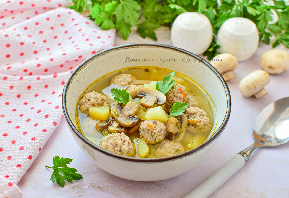 Сразу грибной и мясной суп. Готовится достаточно быстро. Фрикадельки можно приготовить заранее и заморозить. Шампиньоны можно заменить на отварные лесные грибы. Ингредиенты: Мясной фарш смешайте с яйцом, солью и специями. Мясную массу отбейте о дно чаши, чтобы сделать её плотнее. В кастрюле доведите воду до кипения. Слепите небольшие мясные шарики и опустите их в кипяток. Следом добавьте нарезанный картофель. Оставьте варить минут на 15. Отдельно обжарьте измельченные лук и морковь. Овощную зажарку отправьте в кастрюлю с супом. Так же обжарьте нарезанные шампиньоны. Отправьте грибы в суп. Проварите все вместе еще 2-3 минуты и снимите кастрюлю с огня. Можно добавить немного измельченной зелени. Готовый суп разлейте по тарелкам и подавайте к столу. Приятного аппетита! Вам может понравится: Суп с белыми грибами Суп с тушенкой и гречкой в мультиварке Тушеная капуста с фаршем