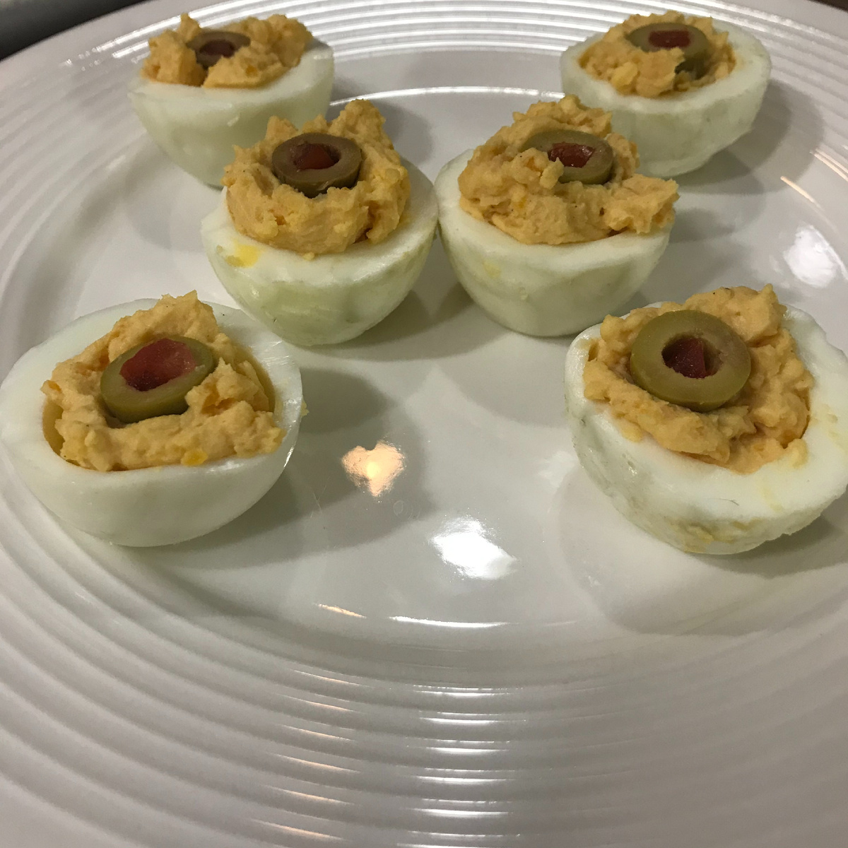 🔹12 оливок, фаршированных перцем. 1️. Выложите яйца в один слой в широкую кастрюлю и полностью покройте их водой. Закройте кастрюлю крышкой и доведите воду до кипения на сильном огне. Снимите с огня и оставьте яйца в воде на 15 минут. Затем переложите их в ледяную воду и полностью остудите.