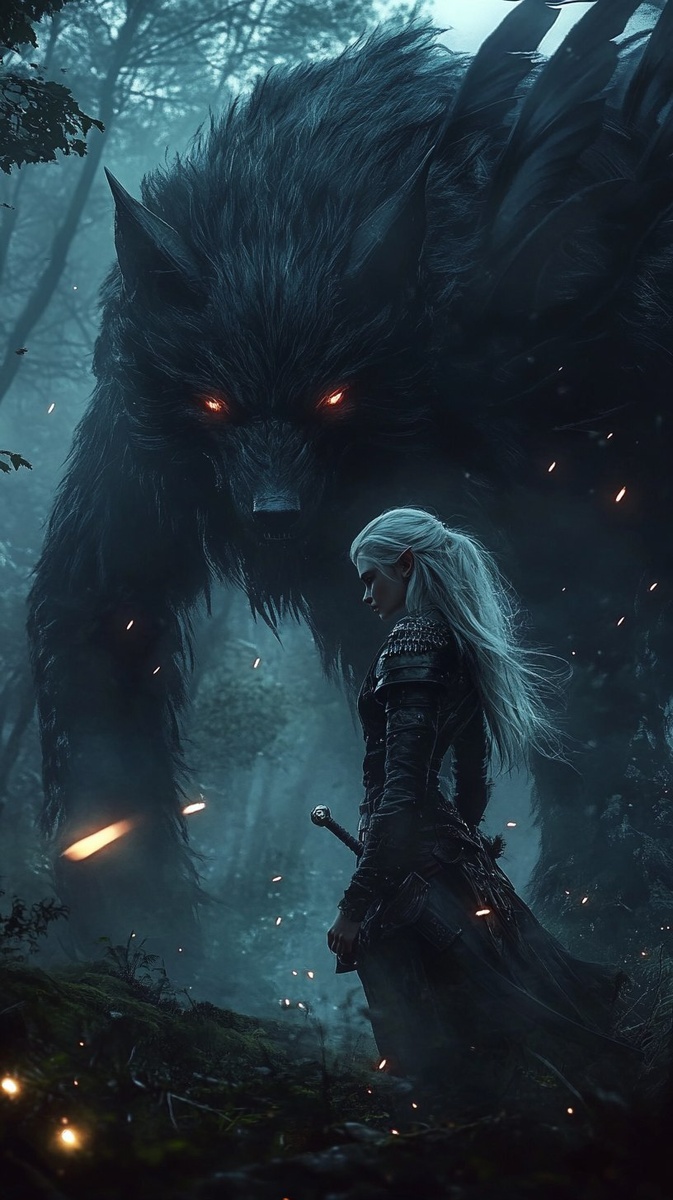 Создано на основе запроса: a warrior girl standing next to a huge black monster with wings and a wolf face, black haze around the monster