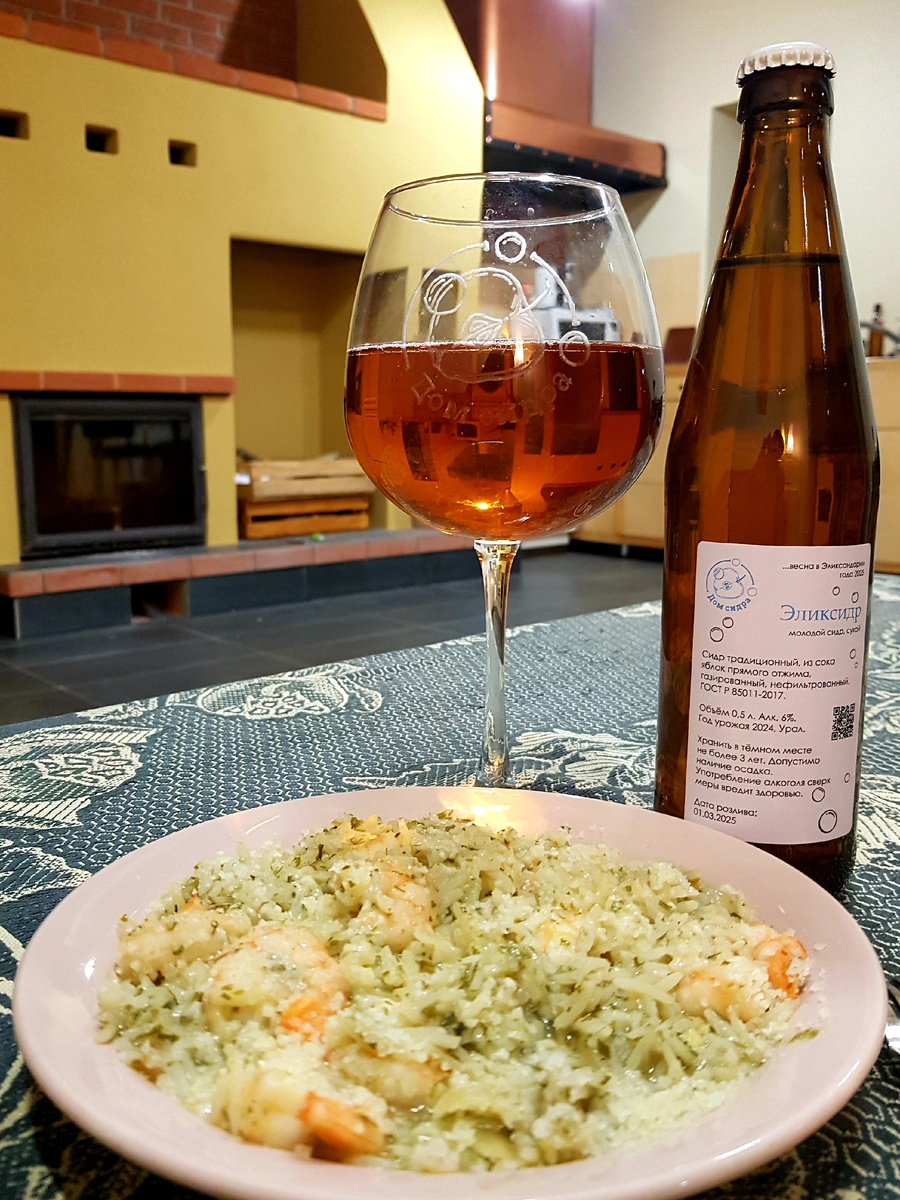 Вчера приготовил ризотто с креветками. А вместо белого вина взял наш новый полусладкий сидр во французском стиле Pépin le Bref … И это было шикарно! Записывайте рецепт ) Итак, нам понадобится совсем немного: Для начала отвариваем сырые креветки. На бульоне из них будем готовить ризотто. К отваренным креветкам добавляем чесночное пюре (ну или что там получается из чеснокодавилки) и оставляем их отдыхать. Бульон сливаем, и тоже отправляем на скамейку ожидания. Промываем рис и оставляем его стекать. Важно, чтобы в рисе осталось как можно меньше капель. В сотейнике (а я использую небольшой казан) пассируем лук на сливочном масле до состояния, когда он начинает нестерпимо вкусно пахнуть, а цвет со светло-золотистого начинает переходить в сторону бронзы. Не сожгите! Добавляем к шкворчащему луку рис и обжариваем его в течение минуты. Рис начнет отдавать свой аромат с ореховыми нотками. Обязательно насладитесь им! Пока рис танцует с луком в экстазе раскаленной страсти у нас есть всег