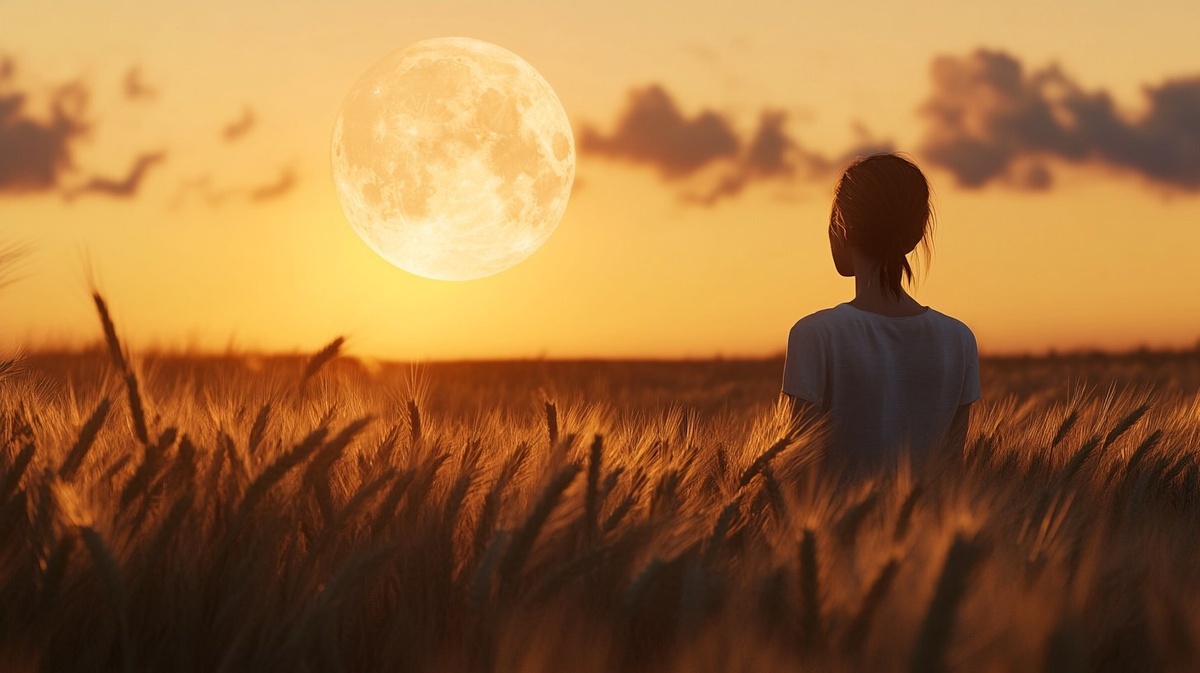 Создано на основе запроса: sillhouette of a young person looking at the moon, landed in a wheat field, illumination, dusk, photorealistic