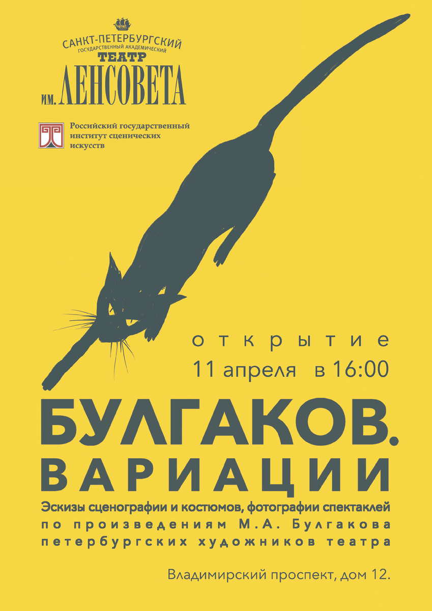 11 апреля в 16.00 в интерьерах Театра имени Ленсовета (Владимирский проспект, 12, Колонное фойе) состоится открытие выставки «Булгаков. Вариации», приуроченной к премьере «Театральный роман» по произведениям М.А.Булгакова в постановке Романа Габриа, она состоится на следующий день.