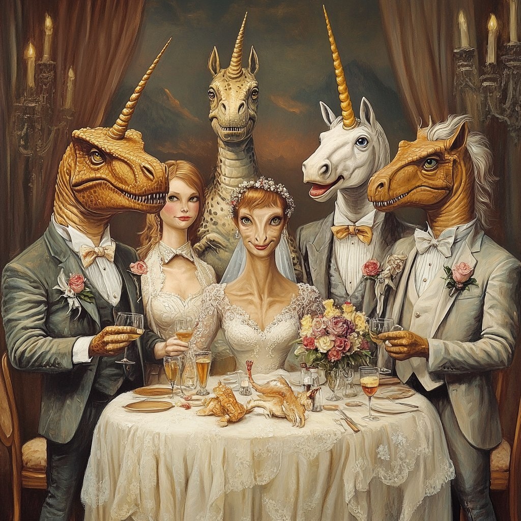Создано на основе запроса: a full wedding party of dinosaurs and unicorns