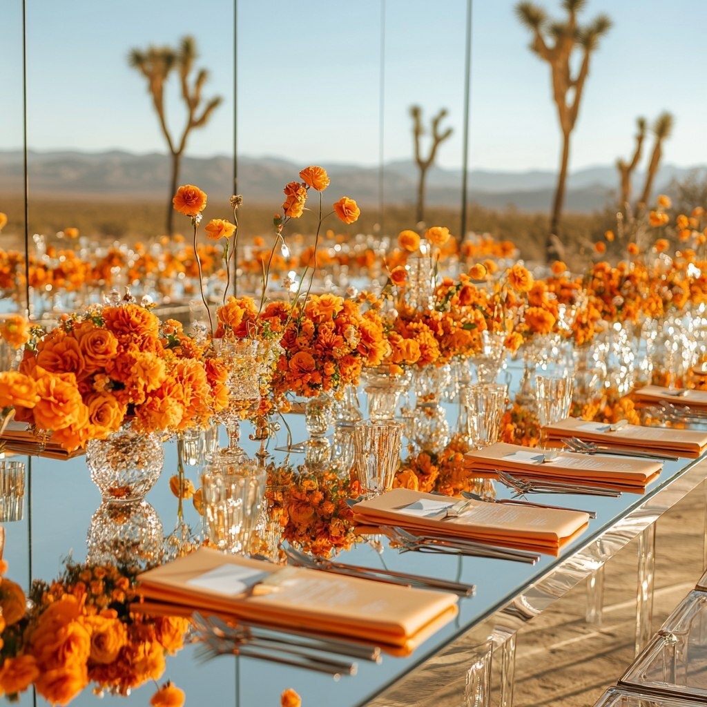 Создано на основе запроса: Realistic image from a headshot view of table wedding in Minimalist Simplicity style with Orange flowers and mirrored tables in The desert